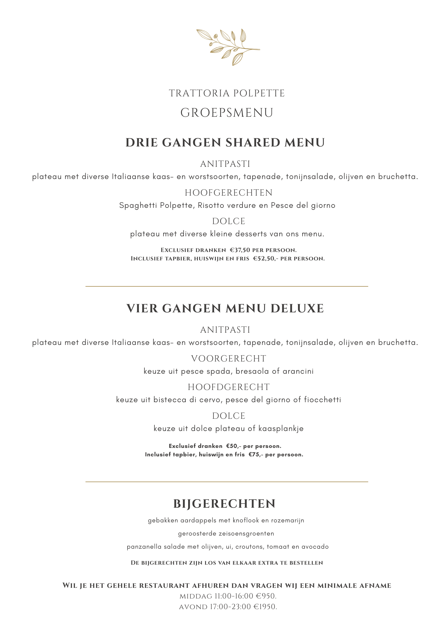 Kom je met een groter gezelschap bij ons komen dineren? Dan bieden wij vanaf 15 personen keuze uit twee groepsmenu's. Indien je gebruik wil maken van één van de onderstaande menu's laat het dan even weten bij je reserveringsaanvraag.