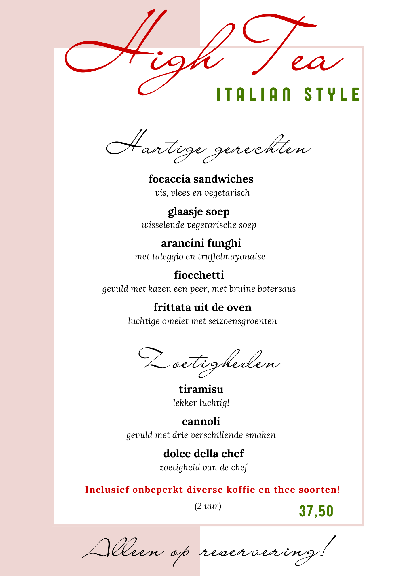 Kom je lekker bij ons op Italiaanse wijze van een high tea genieten? Perfect voor elke gelegenheid zoals babyshowers, vrijgezellenfeesten, bedrijfsborrel of gewoon omdat je er zin in hebt! Reserveer je Italian high tea 12 uur van tevoren via de reserveerknop.